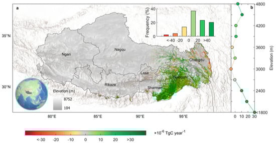 Spatial pattern of the forest biomass carbon sink between 2015 and 2020. (a) Distribution of forest biomass carbon sink. The inset displays the frequency of forest biomass carbon sink. (b) Mean elevational value of forest biomass carbon sink over Tibet. The red region indicates a decrease in biomass and the green region is an increase.