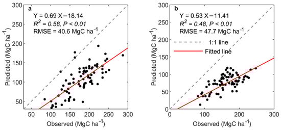 Validation of existing forest biomass maps in mountainous areas of Tibet based on measured samples. (a,b) are the estimated results of Liu et al. [8] and Xu et al. [24], respectively.
