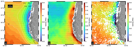 The mean SSS off western Patagonia shows minimum values in a coastal band mostly restricted to the east of 80°W and the meridional extent between the latitudes 54–42°S (Figure 1a). On the other hand, the average maximum salinities are found around the southwest area of the domain, which produces an SSS gradient towards the northeast, reaching the aforementioned salinity minimum. This is consistent with the average surface (0–10 m) salinity from the Argo profiling floats in the study area (Figure 1c). The area of the salinity minimum represents the zone with the highest freshwater content observed in the region, coinciding with the greatest seasonal variability in SSS (Figure 1b). This occurs because of the considerable temporal variability in freshwater discharges into the coastal region. This freshwater pattern coincides with the contribution from rivers and glacial melting in the fjords and channels of Chilean Patagonia (e.g., [9,38]). In addition, the most intense average geostrophic currents occur south of 49°S (Figure 1), increasing in magnitude towards the south, which is consistent with the location of the Cape Horn Current [14,39]. It is noteworthy that the salinity minimum tends to disappear south of 54°S, with salinity values increasing slightly southward (Figure 1a). This is in agreement with the meridional analysis of Saldías et al. [9], in which the stratification was mostly controlled by the cold temperatures off southern Patagonia, and the freshwater content was mostly confined to the coastal ocean off central Patagonia. Another potential explanation for the enhanced southward salinity could be the influence of surface winds. Pérez-Santos et al. [40] identified a more pronounced positive (upwelling) Ekman vertical velocity south of 50°S, facilitating the mixing of saline water from the subsurface layer. Furthermore, Yu [41] highlighted the importance of anomalous vertical entrainment in shaping the sea surface salinity (SSS) characteristics off western Patagonia.