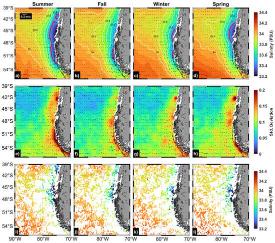 The SSS off western Patagonia has a seasonal cycle marked by the most pronounced saline minimum occurring in summer (Figure 2a). During this season, a contrast in the salinity minimum is evident within the coastal band, as a core with even lower salinities emerges between about 43 and 48°S. There is a lower presence of freshwater in spring compared to summer (Figure 2d), although these two seasons are the ones that exhibit the greatest amount of freshwater in this coastal ocean (e.g., [9]). In spring, the salinity minimum presents a similar spatial distribution (Figure 2d). The lowest salinity is restricted to the coastal area south of 48°S in fall and centered around 51°S (Figure 2b). As mentioned above, the Cape Horn Current is evidenced in the average geostrophic velocities and seems to be fairly persistent throughout the annual cycle (Figure 2). On the other hand, the SSS exhibits its greatest variability (standard deviation) in the coastal band (Figure 2e–h). Notice that the highest salinity variability, except for the area off Chiloé Island around 42°S, occurs primarily in the southern region of the Cape Horn Current (Figure 2e–h). The surface salinity exhibits its greatest variability during the summer season (Figure 2e). It is not clear in which season the lowest variability in salinity occurs; fall, winter, and spring show similar magnitudes of variability (Figure 2f–h), though with differences in the spatial patterns. An analysis of the seasonal variability of surface salinity from the Argo floats reveals differences compared to the seasonal climatology of sea surface salinity (SSS) from OISSS for the same study period (Figure 2i–l vs. Figure 2a–d). The average grid cells from the Argo floats exhibit fresher conditions. These discrepancies result from relatively sparse data points in the Argo float averages compared to satellite SSS images. In fact, a significant portion of the area covered lacks Argo floats in the analysis (white areas in Figure 2i–l).