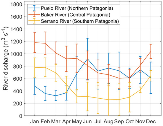Seasonal variability of river discharges for the Palena River (northern Patagonia; blue line), Baker River (central Patagonia; red line), and Serrano River (southern Patagonia; yellow line). The seasonal climatologies were computed using the period 2011–2022.