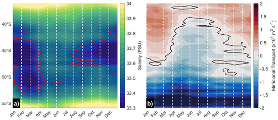 Seasonal variability of (a) surface salinity and (b) meridional geostrophic transport as a function of latitude considering the average fields for a coastal band of 100 km. The red contour in (a) corresponds to the 33.45 psu isoline as in Figure 1 and Figure 2, and the black line in (b) denotes the zero transport isoline.