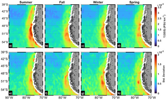 The seasonal salinity gradients off western Patagonia are presented in Figure 5 to evaluate a potential coherence with the seasonal variability of the meridional geostrophic flow field and dominant salinity fronts. As expected, the lowest salinity gradients are found north of 48°S in all seasons. The greatest gradient magnitudes occur in summer south of 47°S (Figure 5a). Conversely, similar average gradient magnitudes are found in fall, spring, and winter, with greater values south of 48°S (Figure 5b–d). The variability (standard deviation) of the SSS gradient is quite similar to the pattern of the gradient itself, with a greater magnitude east of 80°W and a meridional difference west of this longitude (Figure 5e–h). These results indicate an increase in variability towards southern Patagonia (south of 48°S), and a major persistence, or lower variability, of the average SSS gradients off northern Patagonia. Although salinity gradients should be tightly related to horizontal density gradients, and consequently, to geostrophic currents through thermal wind balance [53], a stronger geostrophic Cape Horn Current during fall (April–June) (Figure 4b) should be mainly driven by a barotropic component of the pressure gradient through the sea level [14]. We intend to carry out a future study that will involve a detailed analysis of the driving forces influencing the Cape Horn Current. This analysis will include the integration of modeling results and the utilization of satellite and in situ observations to examine the vertical structures of velocity, salinity, and density fields.