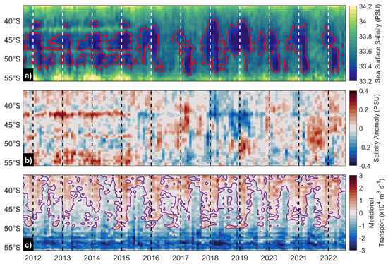Interannual variability of (a) surface salinity, (b) surface salinity anomaly, and (c) meridional geostrophic transport as a function of latitude considering average fields for a coastal band of 100 km. The red contour in (a) corresponds to the 33.45 psu isoline, whereas the purple contour in (c) denotes the zero transport isoline.