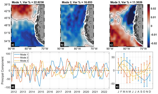 The time series associated with the first principal component represents a marked seasonal variability (Figure 7e), with preferred positive/negative anomalies for particular years (Figure 7d). This first principal component (blue curve) switched from large negative values to mostly positive values in 2016, which suggests an increase in freshwater conditions (lower salinities) with the greatest contribution during most of 2016, 2017, and 2022. Other years post-2016 (e.g., 2018, 2019, and 2021) presented a stronger seasonal pattern. This aligns with the saline minima observed during those years south of 48°S along the coastal band (Figure 6a). The time series associated with the second principal component (Figure 7d) suggests periods of increased freshwater primarily during spring and summer and in phase along the coastal band (Figure 7b). Supporting this signal, a core of minimum salinity is appreciated north of 48°S during 2018–2019 (Figure 6a), also related to the most intense negative anomalies observed (Figure 6b). The time series associated with the third principal component (Figure 7d) shows that there was an inclination towards greater salinities in a tongue north of about 51°S, such as during 2016–2017 (Figure 7c,d).