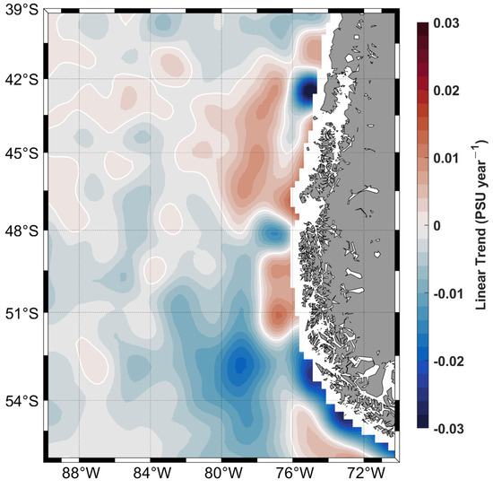The interannual variability of SSS along the coastal band (first 100 km) shows that salinity minima generally occur within the early months of each year. Nonetheless, there is a marked interannual variability (Figure 6a). The salinity maxima extend across the northern and southern tips of our domain. The higher salinities occurred at the southern boundary and within the first 5 years of the study (2011–2015). In contrast, the lower salinities (fresher conditions) developed during the spring–summer of 2018 and 2019. A similar SSS feature was registered by an oceanographic buoy in the Reloncaví Sound, northern Patagonia [54]. Examining the patterns of SSS anomalies (Figure 6b), we observe that higher positive anomalies occurred around 42°S (off Chiloé Island) and south of 52°S during the first 5 years (Figure 6b). The higher salinity anomalies off Chiloé Island during spring–summer could correspond to enhanced coastal upwelling events bringing cold and salty waters off northern Patagonia [36,40,55]. Reduced freshwater conditions occurred during the spring–summer of 2016–2017 and most of 2021 and 2022. On the other hand, negative anomalies prevailed during spring–summer 2015–2016 and the most of 2018 and 2019, indicating a trend towards a greater amount of freshwater during these periods. These findings complement the seasonal patterns found by Saldías et al. [9] and highlight the importance of implementing a long-term monitoring effort to further understand the implications of freshwater outflows and coastal currents off western Patagonia.