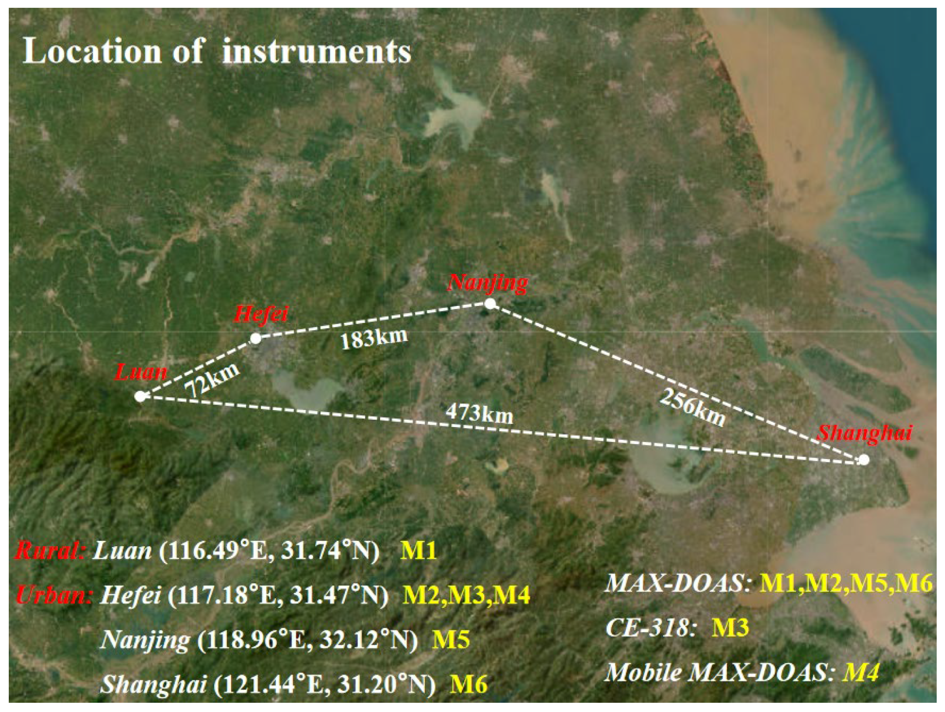 - Zheng, J.; Xie, P.; Tian, X.; Xu, J.; Li, A.; Ren, B.; Hu, F.; Hu, Z.; Lv, Y.; Zhang, Z.; et al. McPrA-A new gas profile inversion algorithm for MAX-DOAS and apply to 50 m vertical resolution. Sci. Total Environ. 2023, 901, 165828. [Google Scholar] [CrossRef] [PubMed]