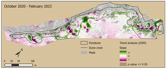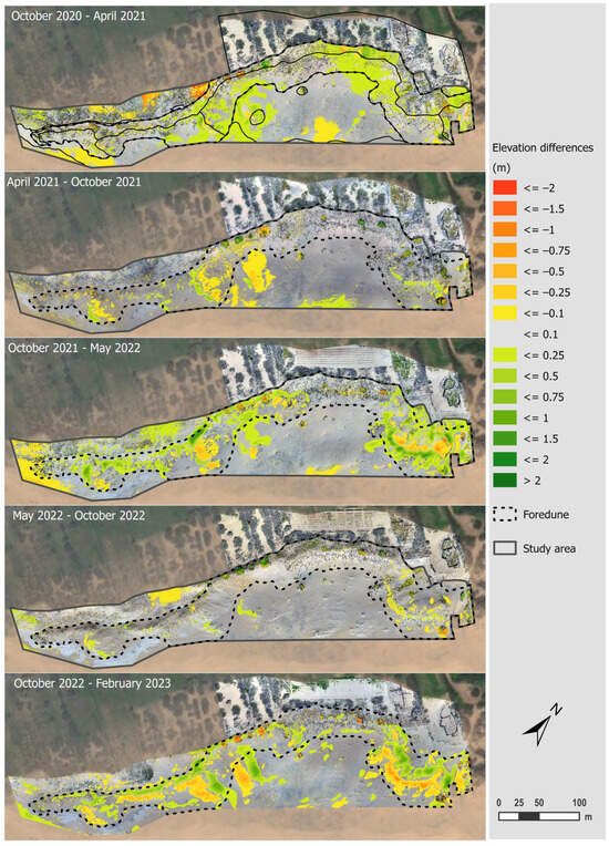 - From May 2022 to October 2022, there was some vegetation growth in the NE foredune section; repeated vegetation removal occurred in the SW foredune section. In the October 2022 orthomosaic, there is an apparent increase in vegetation cover in the central and SW sections of the leeward foredune slope, but this is largely an artifact associated with shaded areas.