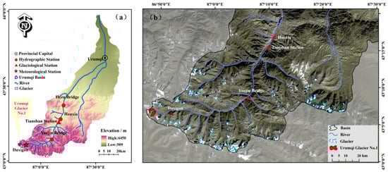 Location of the Urumqi Valley and glacier distribution. (a) is a diagram of the entire Urumqi River basin; (b) is a diagram of all the glaciers involved in the study area.