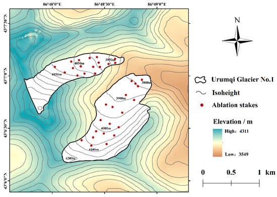 In 1959, we began to measure the glacier mass balance during ablation (May~August) by using flower sticks to confirm the height variation and snow pits to assess the density [43,44]. As illustrated in Figure 2, the stake network spans the whole UHG-1 in order to provide the result of mass balance. For UHG-1, we manually interpolated the measured data between adjacent contours by manually drawing lines of equal mass balance [45].