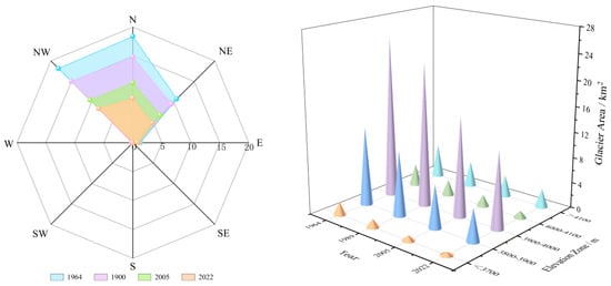 Schematic illustration of the distribution and variation of glacier outlines over time. The left figure shows glacier orientation over time. The right figure shows the changes in glacier area at different altitudes.