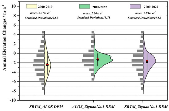 After discounting obviously erroneous extremes from the results of the subtraction of the DEM, most of the variables are tightly clustered around the average value, with only a few at the extremes (Figure 7). The glacier elevation in the URB declined by 44.64 ± 0.69 m during 2000–2022, of which the glacier elevation declined by 23.07 ± 0.53 m on average during 2000–2010, with an annual mean decrease of 2.31 ± 0.05 m·a−1, and by 21.57 ± 0.16 m during 2010–2022, with an annual mean decrease of 1.80 ± 0.01 m·a−1.