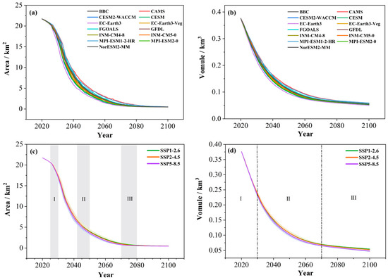 The area and volume change of glaciers in the Urumqi River Basin from 2020 to 2100. Where (a,b) shows the area and volume trends of the 13 climate models under different climate models, respectively; (c,d) presents the mean values of the simulation results of the 13 climate models after processing under the scenarios of SSP1-2.6, SSP2-4.5, and SSP5-8.5. The 13 model patterns described in the legend and whose simulation standard errors are displayed as shaded areas in (c,d). I, II, III represent the different stages of the trend change.