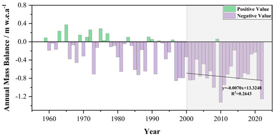 The mass balance obtained from the UHG-1 based on traditional glaciological measurements is shown in Figure 9. It is obvious that the period of maximum positive accumulation of mass balance is between 1960 and 1980. Since 2000, the positive values of glacier mass balance have almost disappeared and the negative accumulation trend of glacier mass balance has intensified, with the highest negative accumulation value in 2010.The annual average values of glacier mass balance of UG-1 for the periods of 2000–2010, 2010–2022, and 2000–2022 are 664 mm w.e.a−1, 666 mm w.e.a−1, and 662 mm w.e.a−1, respectively. Overall, the annual mean mass balance for the period 2000–2022 is stable and shows little fluctuation; it is still suitable as a reference for the same period of time for obtaining the mass balance based on remote sensing. Compared with the annual average mass balance of a single glacier obtained by geodetic methods during the same period of this study, the values are −0.67 m w.e.a−1, −0.71 m w.e.a−1, and −0.69 m w.e.a−1, respectively, and it can be concluded that the mass balances of geodetic and glaciological measurements are in agreement with each other. Taking the glaciological mass balance values as benchmarks, the relative differences between 2000–2010, 2010–2022, and 2000–2022 are only 1.5%, 7.5%, and 4.5%, respectively. Moreover, a linear fit to the mass balance trends obtained by traditional glaciological methods after 2000 showed a stronger negative accumulation trend. The interval of fitted values is from −0.83 m w.e.a−1 to −0.67 m w.e.a−1 and the results obtained in this study fall perfectly in that interval.