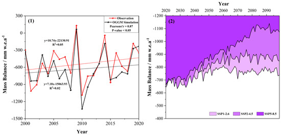 Validation and prediction of glacier mass balance for the OGGM model. (1) Comparison of OGGM-based and observed glacier mass balance for 2000–2020. (2) Future glacier mass balance values based on glacier area and volume from the OGGM model.