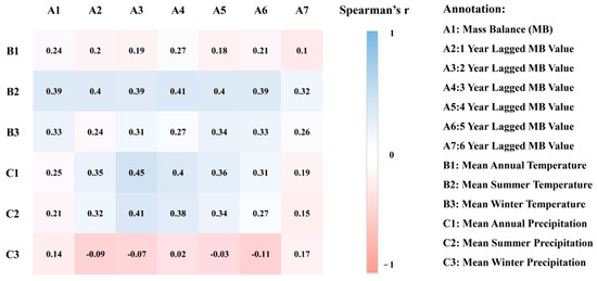 Correlation analysis of different lags of glacial mass balance with air temperature and precipitation.