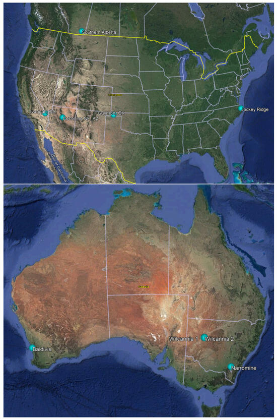 Months before launch, the approval for the underfly was confirmed, but the dates were uncertain as they were dictated by the launch date of Landsat 9. Surface validation field teams throughout the world began discussions on the collection opportunities made available by the underfly. Unfortunately, the uncertainty of the underfly paths and dates made it difficult for some teams to identify a field site for collection. In addition, the event was confirmed only a few months notice prior to the underfly which limited some agencies’ ability to obtain the instrumentation needed for the fieldwork. The global COVID-19 pandemic created additional complexity to travel, site access, and equipment access for many groups. Finally, weather conditions over the field sites were limiting factors for some groups. Five agencies and universities were able to participate in field measurements with little interference from clouds throughout the underfly period. These five groups included USGS ECCOE, University of Arizona, Rochester Institute of Technology (Rochester, NY, USA), Geoscience Australia, and University of Lethbridge (Lethbridge, AB, Canada). Field collection was performed at nine different field sites within the U.S., Canada, and Australia, shown in Figure 1.