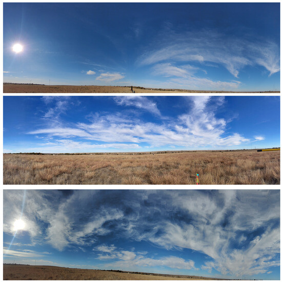 The Guymon field site was located on Oklahoma state-leased land, composed of thick grasses and cacti. The grasses were approximately 20 cm in height, shown in the middle photo of Figure 2. The site measured 200 m by 200 m with increasing elevation on the north end of the site. The cloud cover increased significantly throughout the field collection period as cirrocumulus clouds developed, as seen in Figure 2, impacting measurements.