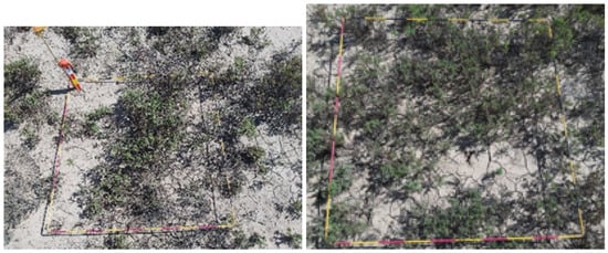 Field collection on 15 November 2021 was conducted over two field sites east of Wilcannia, New South Wales. The first field site, denoted here as Wilcannia 1 shown in Figure 7, was composed of patchy vegetation and bare ground, measuring approximately 100 m by 100 m. Field measurements at Wilcannia 1 were focused on manual collection using an ASD. The second field site, denoted here as Wilcannia 2, was also composed of patchy vegetation and bare ground similar to what is shown in Figure 8. Measurement methodologies were focused on both manual and UAV platforms. Manual collection, using a SR3500, was conducted over an area of approximately 100 m by 100 m. The SR3500 is a portable full range spectroradiometer manufactured by Spectral Evolution in Haverhill, MA that measures 350–2500 nm. For the UAV collection, the FLAME instrument, a miniature spectroradiometer measuring 190–1100 nm, was used over an area of 150 m by 125 m. A majority of the collection areas within Wilcannia 2 were overlapping. Although clouds were initially forecast for the Landsat overpass times, skies remained clear for field collection.
