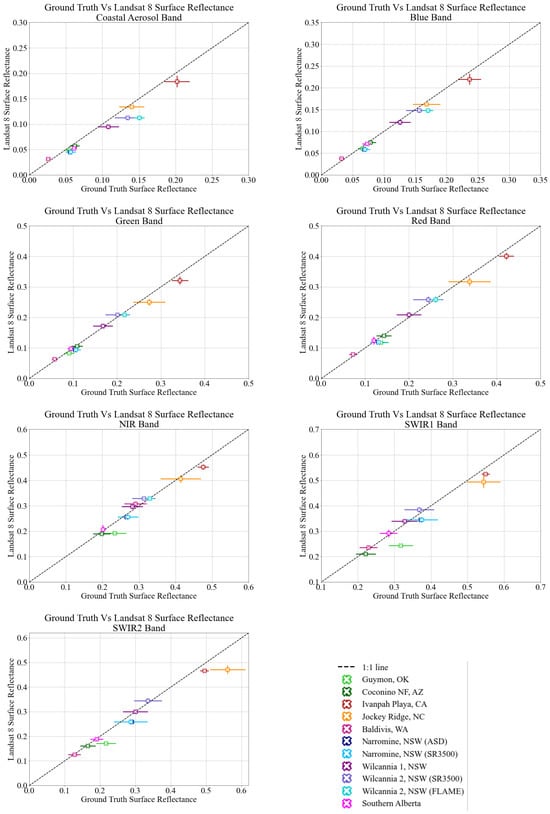 One-to-one plots, with standard deviation bars, are shown for each of the Landsat 8 bands, including results from each field site and instrument. The Guymon site is represented by lime green, Coconino National Forest represented by green, Ivanpah Playa represented by red, Jockey Ridge represented by orange, Baldivis represented by pink, Narromine sASD represented by navy, Narromine SR3500 represented by sky blue, Wilcannia 1 represented by purple, Wilcannia 2 SR3500 represented by slate blue, Wilcannia 2 FLAME represented by dark turquoise, and Southern Alberta represented by fuchsia.