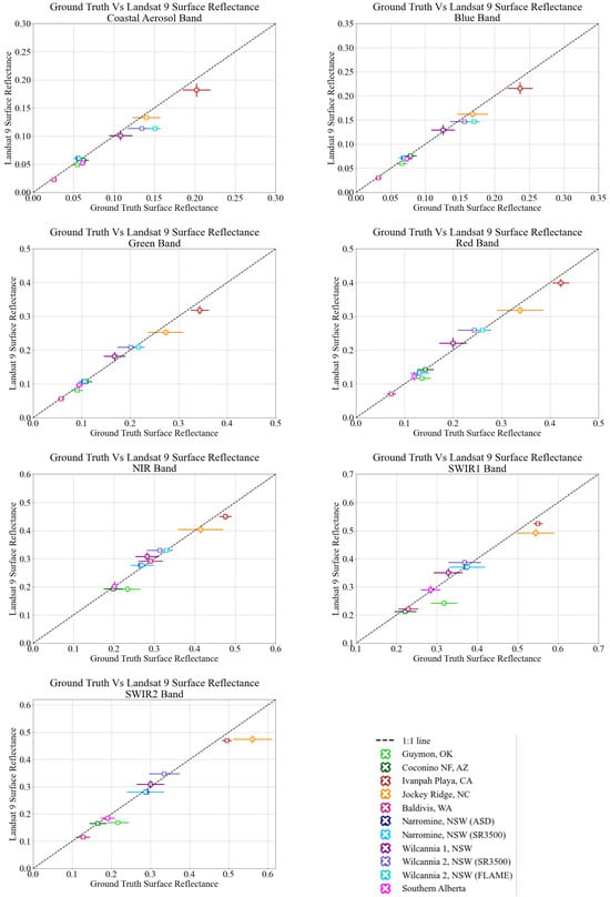 One-to-one plots are shown for each of the Landsat 9 bands, including results from each field site and instrument. The Guymon site is represented by lime green, Coconino National Forest represented by green, Ivanpah Playa represented by red, Jockey Ridge represented by orange, Baldivis represented by pink, Narromine sASD represented by navy, Narromine SR3500 represented by sky blue, Wilcannia 1 represented by purple, Wilcannia 2 SR3500 represented by slate blue, Wilcannia 2 FLAME represented by dark turquoise, and Southern Alberta represented by fuchsia.