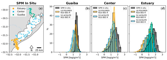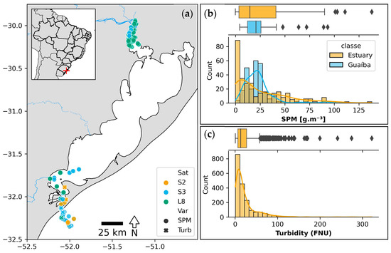 (a) Patos Lagoon (South Brazil) with in situ and satellite matchups for turbidity and SPM. Satellites are shown in different colors (orange, blue, and green indicate Sentinel-2 (S2), Sentinel-3 (S3), and Landsat-8 (L8), respectively), while SPM and turbidity matchups are marked with circles and crosses, respectively. The in situ data frequency distributions for (b) SPM and (c) turbidity are split into southern (estuary, in orange) and northern (Guaíba, in blue) areas of the lagoon.
