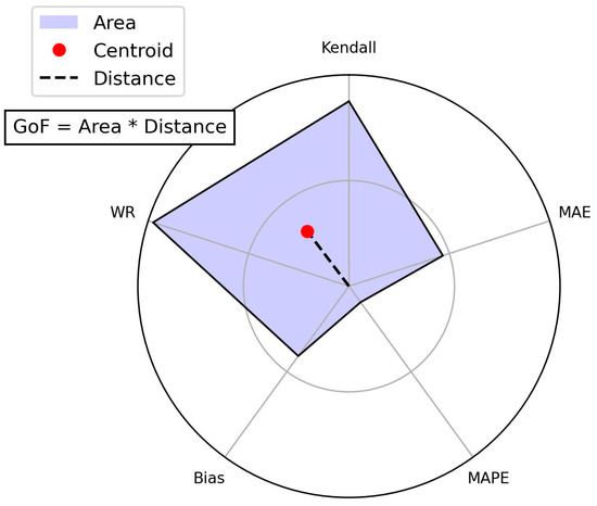 Radar plot with the selected statistical parameters (Kendall, MAE, MAPE, and WR). The resultant polygon area (in blue), centroid (red circle), and distance between the radar plot center and polygon centroid (dashed black line) are represented. The goodness of fit (GoF) metric summarizes the algorithm performance and is given by the product of the area and distance.