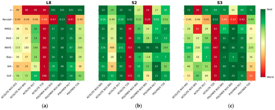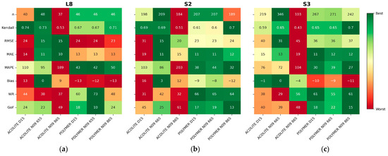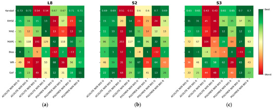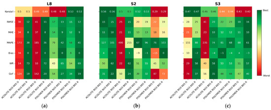 Heatmaps of the SPM algorithm performance, given in g·m−3 (RMSE, MAE, and bias) or percentage (MAPE and WR) for satellites (a) L8, (b) S2, and (c) S3. The best (worst) performance is shown in green (red).