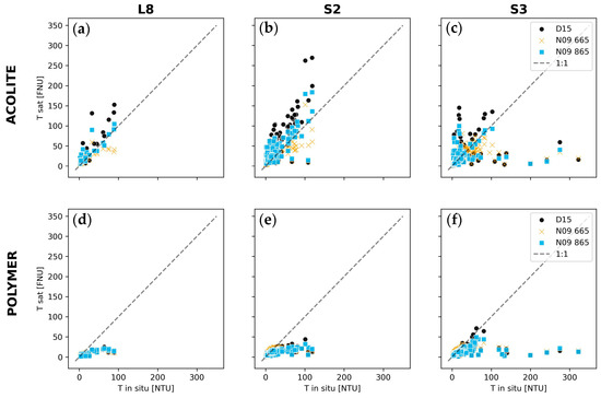 Scatter plots showing the relationships between the measured and estimated turbidity values for satellites (a,d) L8, (b,e) S2, and S3 (c,f), and atmospheric corrections from (a–c) ACOLITE and POLYMER (d–f). For each satellite and atmospheric correction, multiple algorithms (D15 and N09) and bands (665 and 865 nm) are shown.