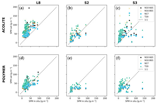 Scatter plots showing the relationships between the measured and estimated SPM concentrations for satellites (a,d) L8, (b,e) S2, and S3 (c,f), and atmospheric corrections from (a–c) ACOLITE and POLYMER (d–f). For each satellite and atmospheric correction, multiple algorithms (N10, N17, and T20) and bands (665 and 865 nm) are shown.