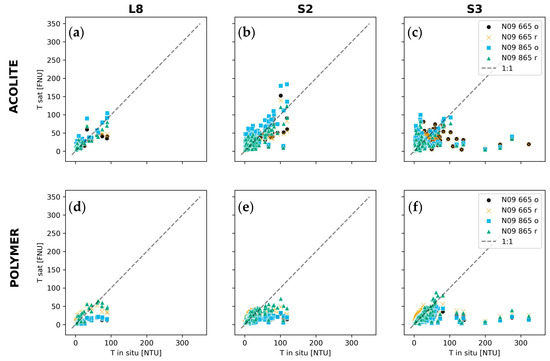 Scatter plots showing the relationships between the measured and estimated turbidity values for satellites (a,d) L8, (b,e) S2, and (c,f) S3, and atmospheric corrections from (a–c) ACOLITE and (d–f) POLYMER. For each satellite and atmospheric correction, multiple algorithms (N09) and bands (665 and 865 nm) are shown with the original (o) or recalibrated (r) coefficients.