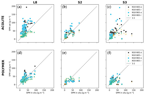 Scatter plots showing the relationships between the measured and estimated SPM concentrations for satellites (a,d) L8, (b,e) S2, and (c,f) S3, and atmospheric corrections from (a–c) ACOLITE and (d–f) POLYMER. For each satellite and atmospheric correction, multiple algorithms (N10) and bands (665 and 865 nm) are shown with the original (o) or recalibrated (r) coefficients.