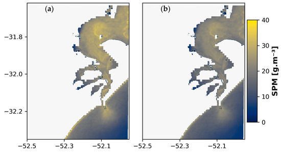 Mean SPM concentration in the Patos Lagoon estuary based on S2 scenes, ACOLITE atmospheric correction, the N10 algorithm, the 665 nm band, and (a) original or (b) regionally recalibrated coefficients.
