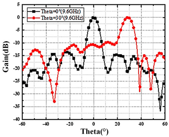 Figure 4. The actual gain in 9.6 GHz at 0° and 30° beam directions.