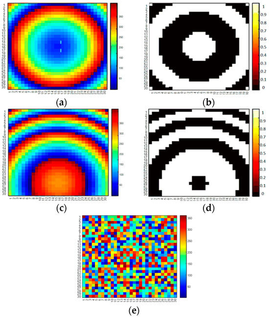 Figure 5. The phase distributions for different beam directions. (a,b) 0° beam direction. (c,d) 30° beam direction. (e) Random diffuse reflection.