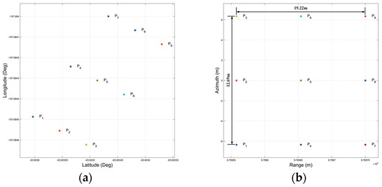 Figure 7. The distribution of targets for simulation. (a) Distribution of targets on the surface of earth. (b) Distribution of targets in slant range plane after deramping.