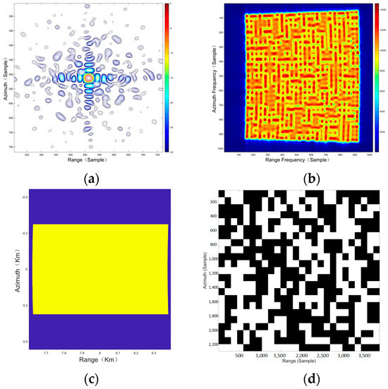 Figure 9. The simulation for a point target is not modulated. (a) Imaging results. (b) Two-dimensional spectrum of the SAR echo. (c) Amplitude of the SAR echo. (d) Zero digital encoding array.