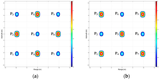The simulation results for a 3 × 3 array of point targets, each integrated with information metasurfaces (ranging from point P1 to P9), are primarily employed to validate the efficacy of multi-mode jamming protections. These protections, inclusive of EM deception and the generation of multiple false targets, are explicitly designed to safeguard critical targets. As illustrated in Figure 10, by modulating the CBC of different information metasurfaces, such as P1 and P6, the amplitude and phase of the corresponding SAR image can be artificially manipulated. This manipulation facilitates the transformation of the SAR image of point P3 into that of point P6, with distinct contours representing different CBCs, thereby accomplishing the objective of EM deception. Specifically, the amplitude of CBC for point P1 escalates from −14.16 dB (mode I, Figure 10a) to −3.31 dB (mode II, Figure 10b), whereas point P6 exhibits a diametrically opposite trajectory.