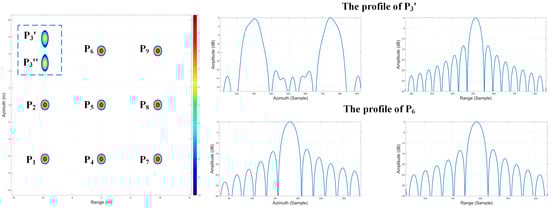 Furthermore, the introduction of a finite Dirac comb function j = t 1 t 2 δ i j to modify the CBC phase of point P3 effectively generates multiple false targets, as clearly visible within the blue region depicted in Figure 11. Notably, when the CBC phase of P3 is adjusted by a time-limited impulse train with an amplitude of 0.75π, two false images of P3 emerge within the region demarcated by blue dashed lines, forming around it along the azimuth direction. The underlying reason for this phenomenon is the multiplication of the finite Dirac comb function with the echo signal in the frequency spectrum, which is equivalent to the convolution of their inverse fast Fourier transforms in the time domain. This operation shifts the energy of the echo signal to incorrect positions, thereby resulting in the emergence of multiple spurious images. Therefore, the utilization of a finite Dirac comb function with varying periods and amplitudes can produce false targets at different locations and in varying quantities within the SAR image domain. The flexibility of this method offers new possibilities for electronic countermeasure strategies, allowing for the adjustment of jamming tactics based on specific scenarios to meet diverse tactical requirements. It is particularly noteworthy that, in comparison to the SAR image profile of point P6, the profiles of the false targets P3′ and P3″ exhibit certain inaccuracies, with the main lobe showing slight deformation and the side lobes displaying irregular amalgamations. This occurrence is primarily due to the incomplete segmentation of the signal spectrum, which affects the correct reconstruction of the frequency components of the echo signal, thereby producing distorted false targets in the SAR image. This finding underscores the importance of precision in signal processing during jamming operations, especially when designing complex jamming patterns using information metasurface, necessitating meticulous control over the spectral processing of the jamming digital encoding array to ensure the accuracy and effectiveness of the jamming effects.
