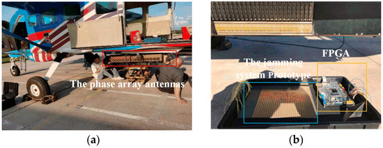 Figure 14. The hardware system of the experiment. (a) Phased array antennas outside the cabin. (b) the information metasurface jamming system prototype.