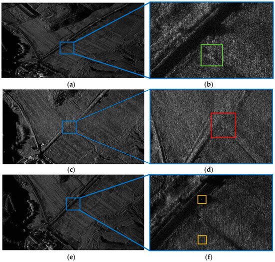 The flight results are presented in Figure 17. A discernible comparison of the target’s jamming effect in the different operational modes of the jamming system is observed. When the information metasurface-based jamming system prototype remains deactivated, the EM scattering characteristics of the critical target vehicle are clearly identifiable in the SAR image (as shown in Figure 17b), marked by a green square. This feature does not match the SAR characteristics of the surrounding vegetation, making the target easily identifiable by intelligent SAR target detection and recognition algorithms. Conversely, when the information metasurface-based jamming system prototype is activated, the EM scattering characteristics of the critical target vehicle become blurred in the SAR image (as shown in Figure 17d), marked by a red square, blending seamlessly with the SAR characteristics of the surrounding vegetation, effectively reducing the accuracy of intelligent SAR target detection and recognition algorithms. The similarity between the SAR imaging features of the protected target and the surrounding vegetation background is 87.2%, thereby achieving effective EM deception. When the digital encoding array based on the finite Dirac comb function method is integrated into the jamming system prototype (with the variation frequency set at 1250 KHz), it is distinctly observable in the SAR image (as depicted in Figure 17e) that two false targets of information metasurface, as indicated by amber squares. If the information metasurface covers the entire body of the vehicle, it becomes clearly observable that two false targets, resembling the critical target vehicle, emerge. These differ significantly from the SAR characteristics of the surrounding vegetation, effectively confusing intelligent SAR target detection and recognition algorithms.