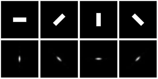 Rectangular pupils with different rotation angles and their point spread functions: 0°, 45°, 90°, and 135°, from left to right.