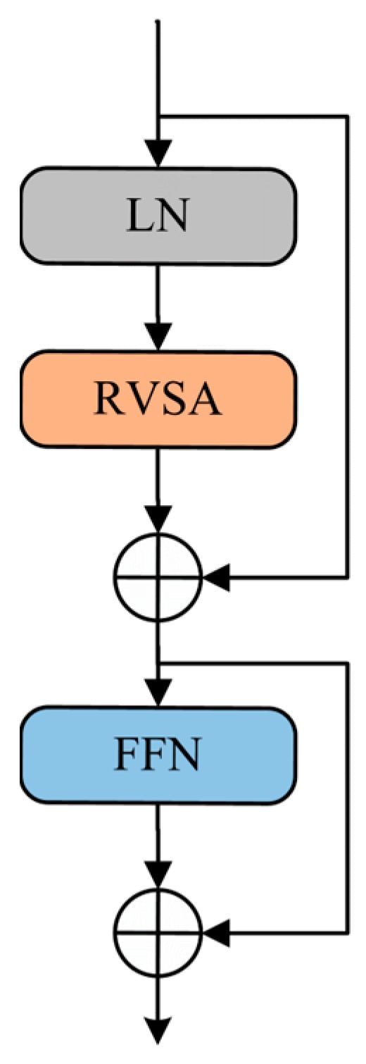 The structures of the rotated varied-size window-based attention block. It includes layer normalization (LN) [39], rotated varied-size multi-head attention (RVSA), and a feed-forward network (FFN).