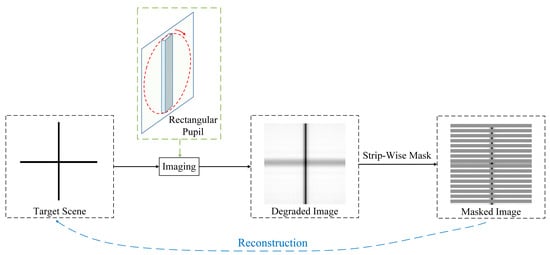 Due to the high orbit altitude and the fact that the imaging object distance is tens of times greater than that of a low Earth orbit, high-orbit remote sensing satellites require a larger aperture to ensure imaging quality. Various techniques have been developed to overcome the aperture limitations, such as segmented mirror technology, membrane diffraction imaging technology, optical synthetic aperture technology, and rotating synthetic aperture (RSA) technology. The segmented mirror technology employs segmented sub-mirrors to assemble into a large aperture primary mirror. The sub-mirrors are folded during launch and expanded after entering orbit. During the imaging process, it is imperative to guarantee that each sub-mirror is accurately assembled. The primary mirror expansion and support structure’s complexity result in elevated expenses [7,8]. The membrane diffraction imaging technology utilizes thin-film materials to create imaging devices. Under the precondition of achieving the same resolution ability, the system mass is only one-seventh of that of a traditional large-aperture single-reflection mirror system, considerably decreasing the rocket-carrying capacity requirements. The membrane mirror’s surface necessitates lower precision than a traditional reflection mirror, which reduces manufacturing difficulty and enables mass production, with potential for significantly lower costs. However, this system has the disadvantage of color dispersion, with a narrow spectral response range of only approximately 40 nm, and lower diffraction efficiency, which limits the system’s practical application to some extent [9,10,11]. The optical synthetic aperture imaging technology is based on interferometric imaging principles, employing small-aperture systems to synthesize a large-aperture system. Similar to the segmented mirror technology, its advantage is avoiding the processing of large-aperture lenses and reducing launch costs by using small-aperture systems. However, the synthesis of the large-aperture must come at the expense of reducing light flux, resulting in a reduced signal-to-noise ratio. This system must satisfy the co-phasing condition to attain ideal imaging, and therefore error monitoring and precise phase adjustment make the engineering implementation of the system extremely challenging [12,13,14]. Compared to the methods mentioned above, the RSA system presents a more advanced alternative. It employs a primary mirror that is rotatable and possesses a large aspect ratio, as illustrated in Figure 1. Through the rotation of the primary mirror, a sequence of images is generated, capturing high-resolution information from various directions. However, this also results in significantly higher resolution along the long edge compared to the short edge [15,16,17,18]. Furthermore, the rotation generates periodic fluctuations in image quality, making it essential to employ image enhancement techniques to improve the quality of the imaging system.