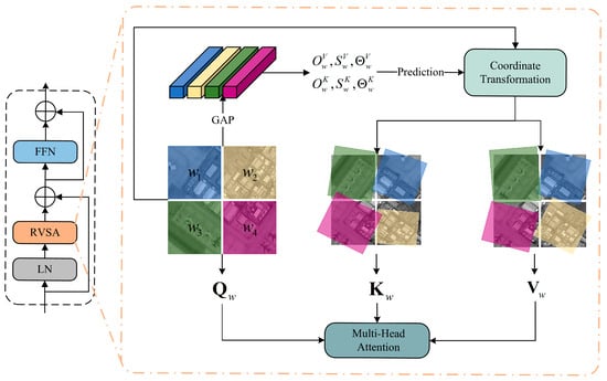 It is well known that remote sensing images often contain various target objects with arbitrary orientations and different scales. Therefore, a fixed and unchangeable window is not an optimal design. Unlike the original window-based attention operations, RVSA (as shown in Figure 6) does not rely on fixed-size window partitions at a fixed orientation. Instead, it produces windows with different positions, sizes, shapes, and angles by adjusting learnable shift, scale, and rotation parameters (Ow, Sw, and , respectively). Specifically, distinct prediction layers can be employed for each window to estimate the shift, scale, and rotation parameters for key and value tokens, relying on the input features: