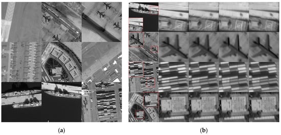 To validate the effectiveness of the proposed method, two types of experiments were conducted: digital simulation and semi-physical imaging simulation. The digital simulation experiment utilized high-resolution remote sensing images as inputs. These images were downsampled, and a full-link digital approach was employed to simulate the degradation of imaging quality in the RSA system [44]. This simulation generated degraded images, which were then used for constructing datasets. Specifically, we obtained a total of 210 original scene images from the WorldView-3 satellite data. For each scene, we conducted 24 sets of image simulations, encompassing six aspect ratios ranging from 3 to 8, and four primary mirror rotation angles: 0°, 45°, 90°, and 135°. As a result, the dataset consisted of a total of 5040 images. Of these, 90% were allocated for the training set, totaling 4536 images. Figure 7 illustrates some of the target scenes and their degraded images obtained through the digital simulation method. These images demonstrate that the resolution of the images acquired by the RSA system varies significantly in different directions, as evidenced by the markings on the decks of naval vessels, the edges of shipping containers, airplanes, and square buildings.