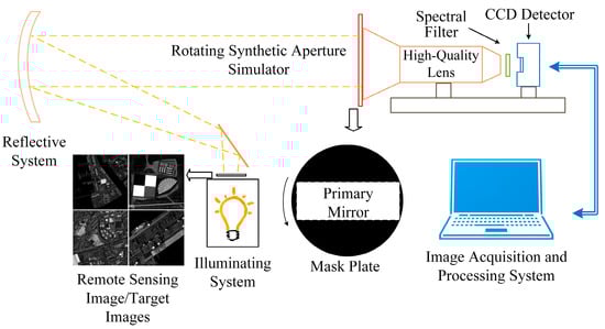 In the semi-physical imaging simulation experiment, an imaging platform was utilized to simulate the RSA system’s imaging process for imaging target scenes or resolution targets [17]. The captured real images were used for testing purposes. Figure 8 displays the design scheme diagram, while Figure 9 displays the physical diagram.