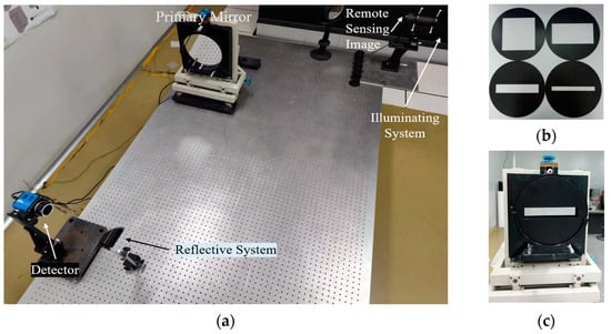 (a) Semi-physical imaging experiment platform; (b) rectangular pupil optical elements; (c) the primary mirror with a rectangular pupil optical element [44].