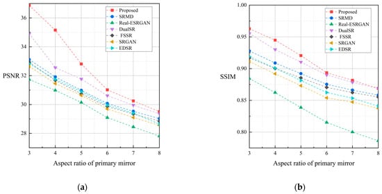 Table 3 presents a quantitative evaluation of the aforementioned methods, utilizing two quality metrics, namely, PSNR (Peak Signal-to-Noise Ratio) and SSIM (Structural Similarity) [45]. These metrics gauge the level of resemblance between two images. The table also includes the results obtained through bicubic interpolation for the purpose of comparison. It contains the super-resolution results for six different scenes, each with six different aspect ratios of the rectangular primary mirror. To provide a comprehensive overview, Table 4 and Figure 10 show the average results for all test images.