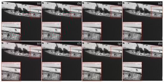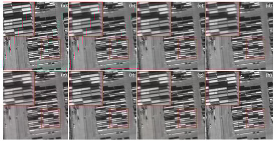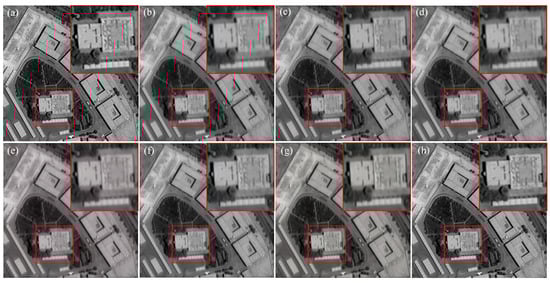 In addition to the quantitative evaluations provided by the full-reference metrics mentioned earlier, we present visual results as qualitative evaluations for the scenes depicted in Figure 7. Figure 11, Figure 12, Figure 13 and Figure 14 illustrate the super-resolution outcomes for SRGAN, EDSR, SRMD, real-ESRGAN, DualSR, FSSR, and the proposed method. Additionally, Figure 15 displays semi-physical imaging experimental images with a primary mirror aspect ratio of 3 and a rotation angle of 90. Specifically, the local enlargement image is shown in Figure 15a, while the SR results generated by SRGAN, EDSR, SRMD, real-ESRGAN, DualSR, FSSR, and the proposed method are displayed in Figure 15b–h, respectively.